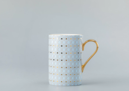 Твердый фарфор, надглазурная деколь, роспись золотом. Автор формы - Серафима Яковлева. Рисунок выполнен по мотивам росписи Алексея Воробьевского....